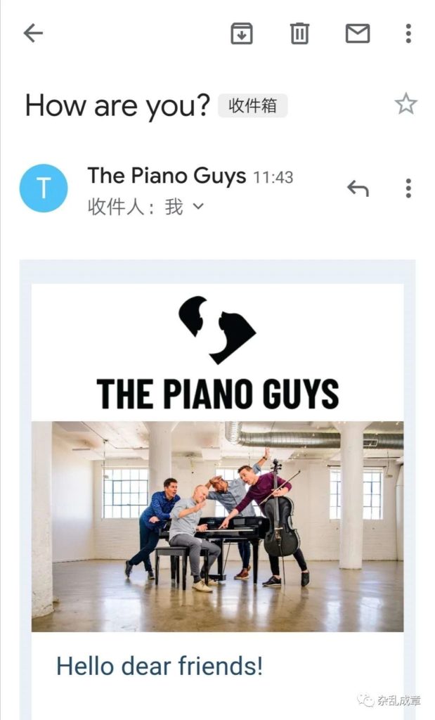 今天收到两封邮件。一封来自孩子的课外音乐课Music Together,下学期课程全部转到网上授课,并且费用全免。另一封来自我一直喜爱的音乐团体The Piano Guys, 除了向粉丝问好之外,他们甚至公布了一个电话号码+1-801-217-9512接收短信并保证一定会回复,他们希望和在疫情中的每个人直接沟通,用音乐之外的方式。信中有一段话很打动我,“You are the kind that hopes so hard it lifts the world around you. Over the next little while we want to do all we can to produce some things that will harmonize with your hope.”(你就是那努力用希望带动周围的人,而我们也将竭尽所能成为你愿望的和声)。