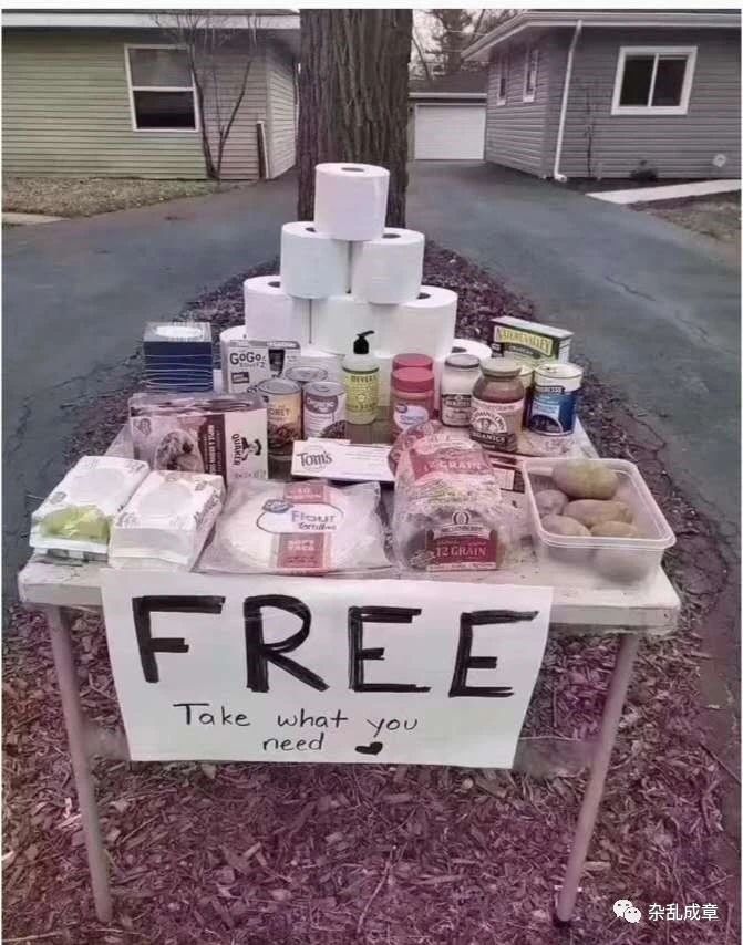 上午还在朋友圈看到朋友Nancy放的一张照片。社区里有人主动将自己囤的货放在路边供有需要的人自取。当9个省宣布进入紧急状态之后,不用政府出面协调物资分配,民众已自行开始共享必需品。